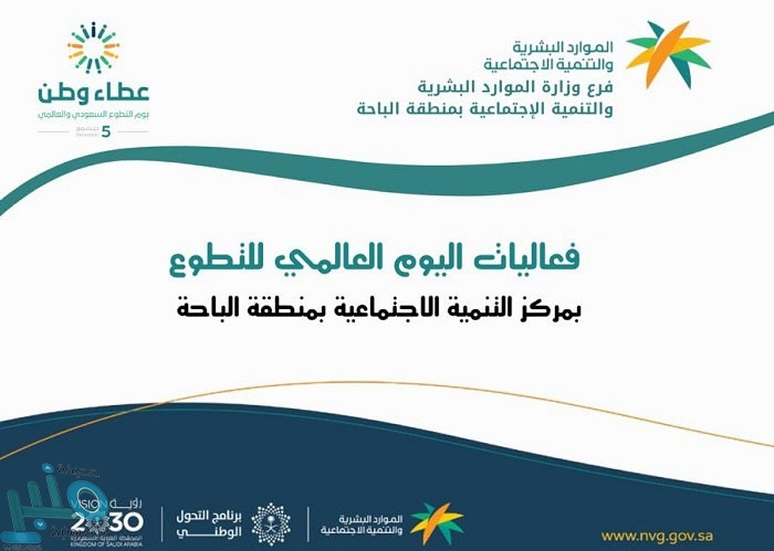 يقيم مركز التنمية الاجتماعية بمنطقة الباحة عددًا من المبادرات ضمن فعاليات اليوم العالمي للتطوع.