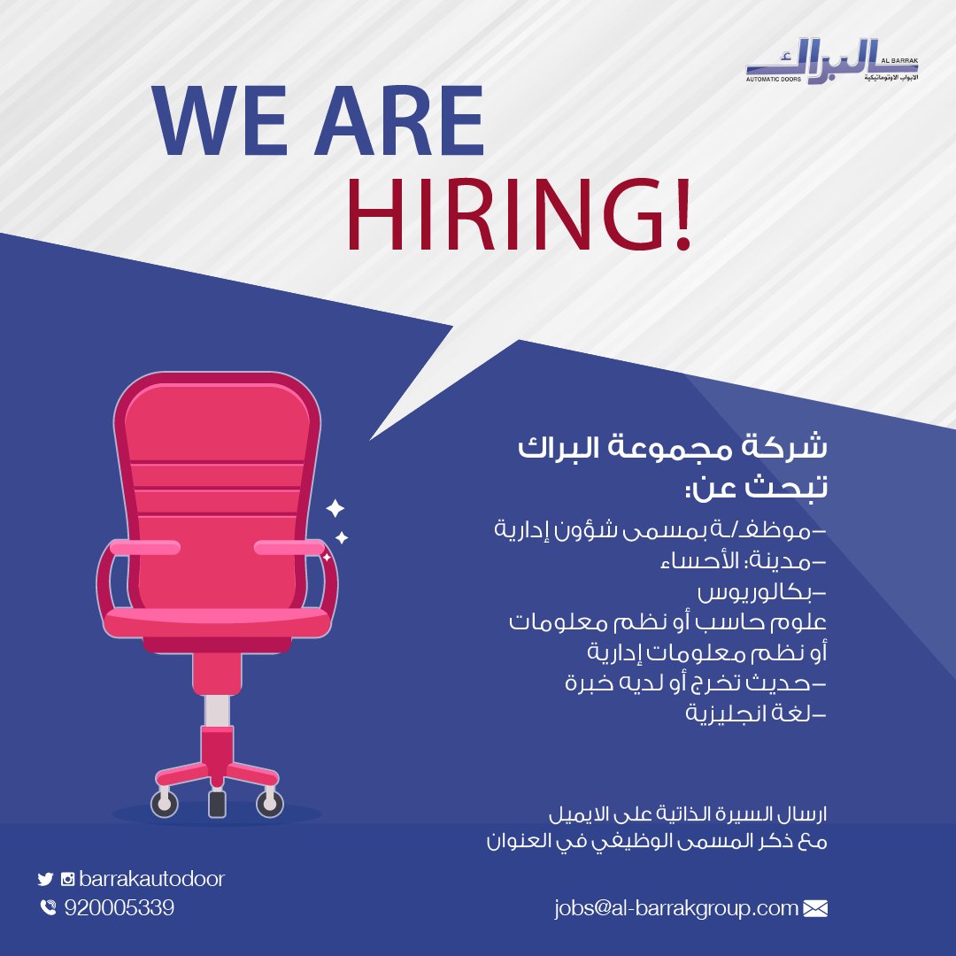 أعلنت شركة البراك للأبواب الأوتوماتيكية توفر وظائف شاغرة (للرجال والنساء)، بمسمى (موظف شؤون إدارية)، للعمل بالشركة في محافظة الأحساء، واشترطت الشركة أن يكون المتقدم سعودي الجنسية، وذلك وفقاً للتفاصيل الموضحة أدناه.