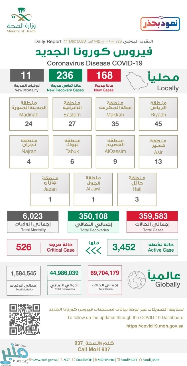 وأضافت الصحة أن إجمالي حالات المصابين في المملكة وصل إلى 359583 حالة حتى الآن ، ووصل مجموع المتعافين إلى 350108 حالة ، فيما بلغ إجمالي الوفيات 6023 حالة وفاة .