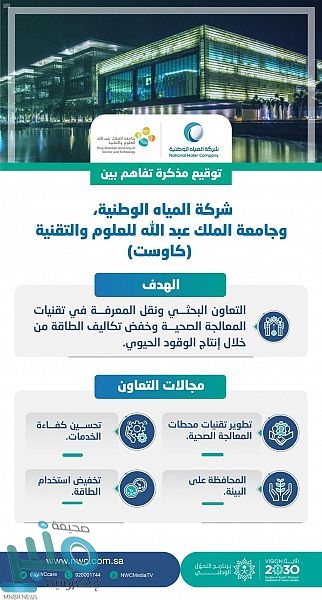 وقعت شركة المياه الوطنية، مع جامعة الملك عبد الله للعلوم والتقنية (كاوست) مؤخرًا، مذكرة تفاهم للتعاون ونقل المعرفة في برامج بحثية تشمل الموضوعات ذات الاهتمام المشترك بين الطرفين في مجالات تقنيات المعالجة الصحية.