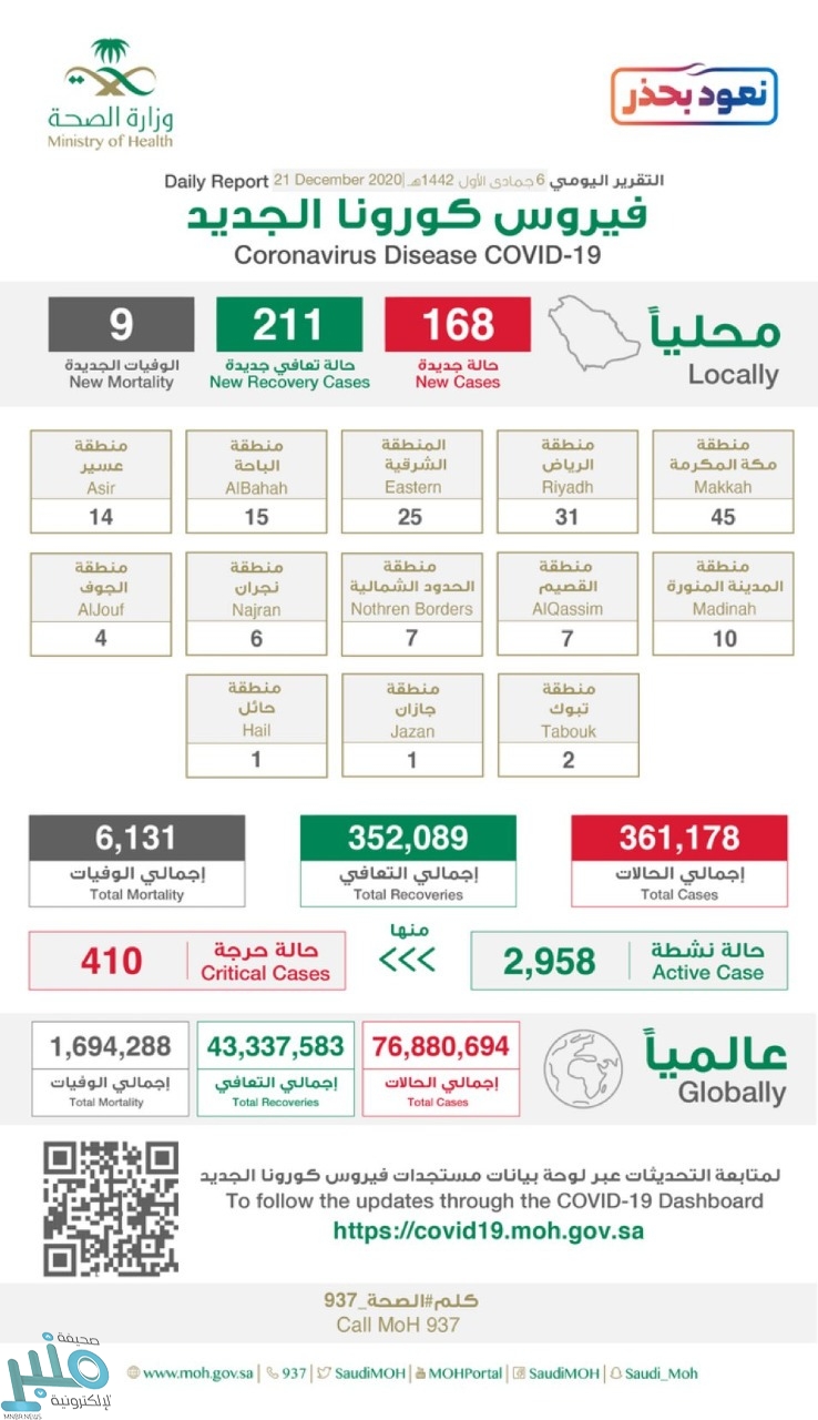 وأضافت الصحة أن إجمالي حالات المصابين في المملكة وصل إلى 361178 حالة حتى الآن ، ووصل مجموع المتعافين إلى 352089 حالة ، فيما بلغ إجمالي الوفيات 6131 حالة وفاة .