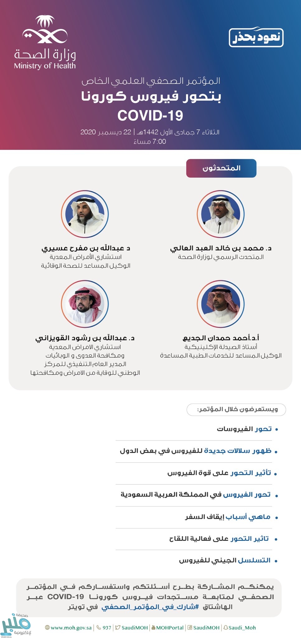 تعقد وزارة الصحة اليوم الثلاثاء الموافق 22 ديسمبر 2020 ، مؤتمرًا صحفيًّا للحديث حول آخر مستجدات فيروس كورونا المستجد في المملكة في تمام الساعة 7 مساءً.