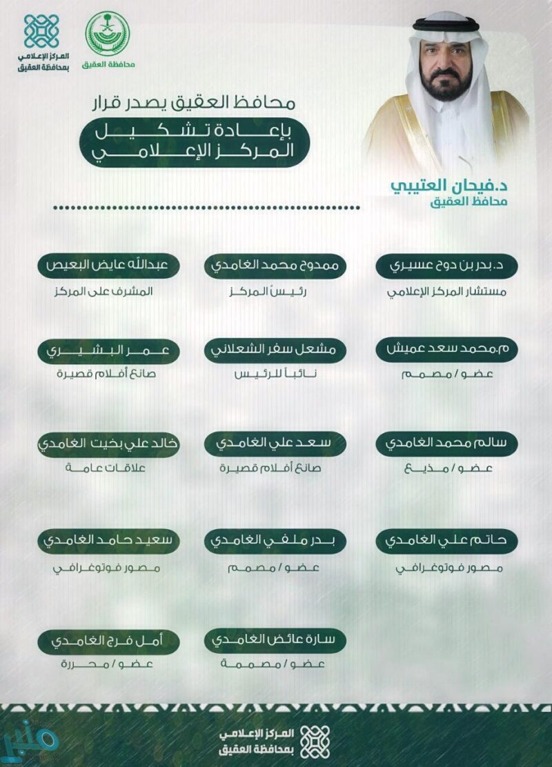 أصدر محافظ العقيق الدكتور فيحان بن حمود العتيبي، قرارًا بإعادة تشكيل المركز الإعلامي بالمحافظة، حيث اعتمد قرار المحافظ على أن يكون الإعلامي ممدوح بن محمد الغامدي رئيسًا لفترة ثانية، والإعلامي مشعل بن سفر الغامدي نائبًا للرئيس، والأستاذ عبدالله بن عائض البعيص مشرفًا والدكتور بدر بن دوح مستشارًا للمركز واختيار ١٠ أعضاء.