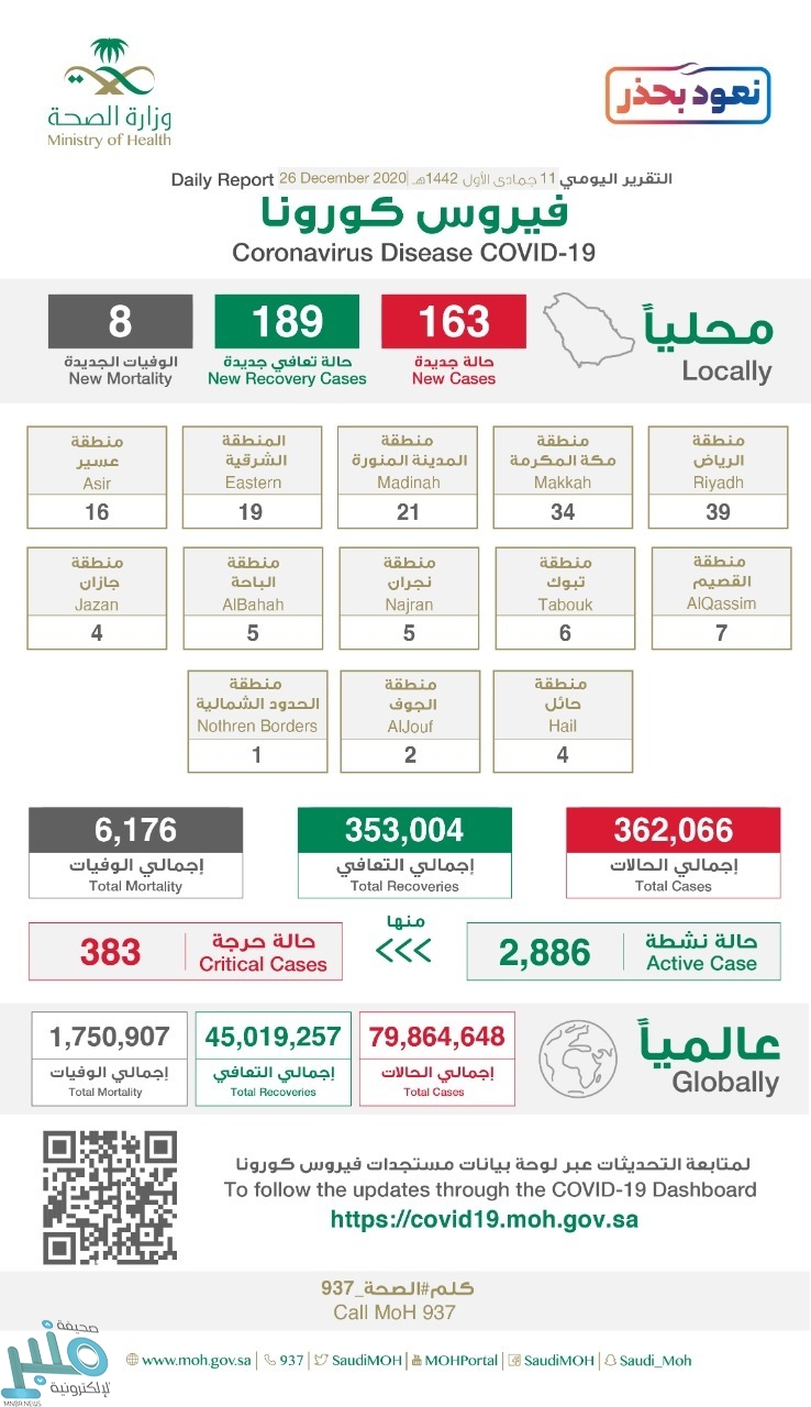 وجاء توزيع حالات الإصابة الجديدة بين مناطق المملكة كالتالي :