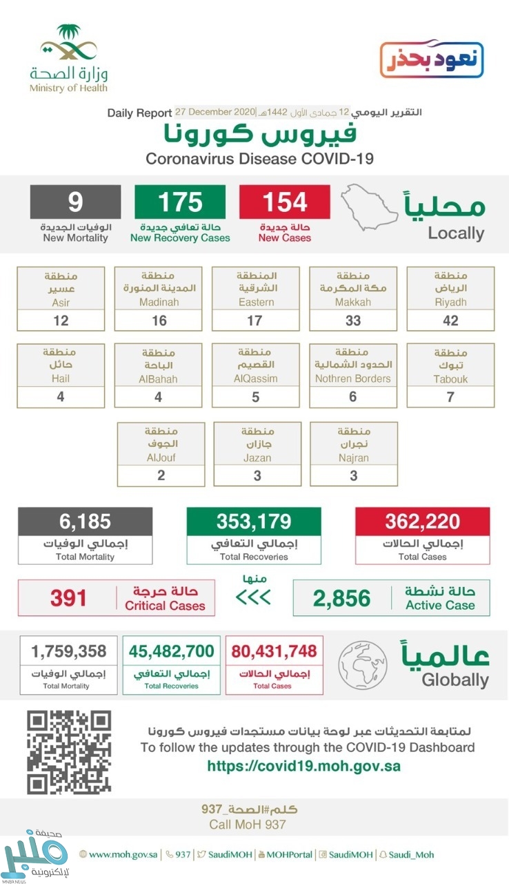 وأبانت أنه تم تسجيل 175 حالة تعافٍ جديدة، ليصل إجمالي عدد المتعافين إلى 353179 حالة، لافتة إلى أن هناك 2856 حالة نشطة حالياً، من بينها 391 حالة حرجة.