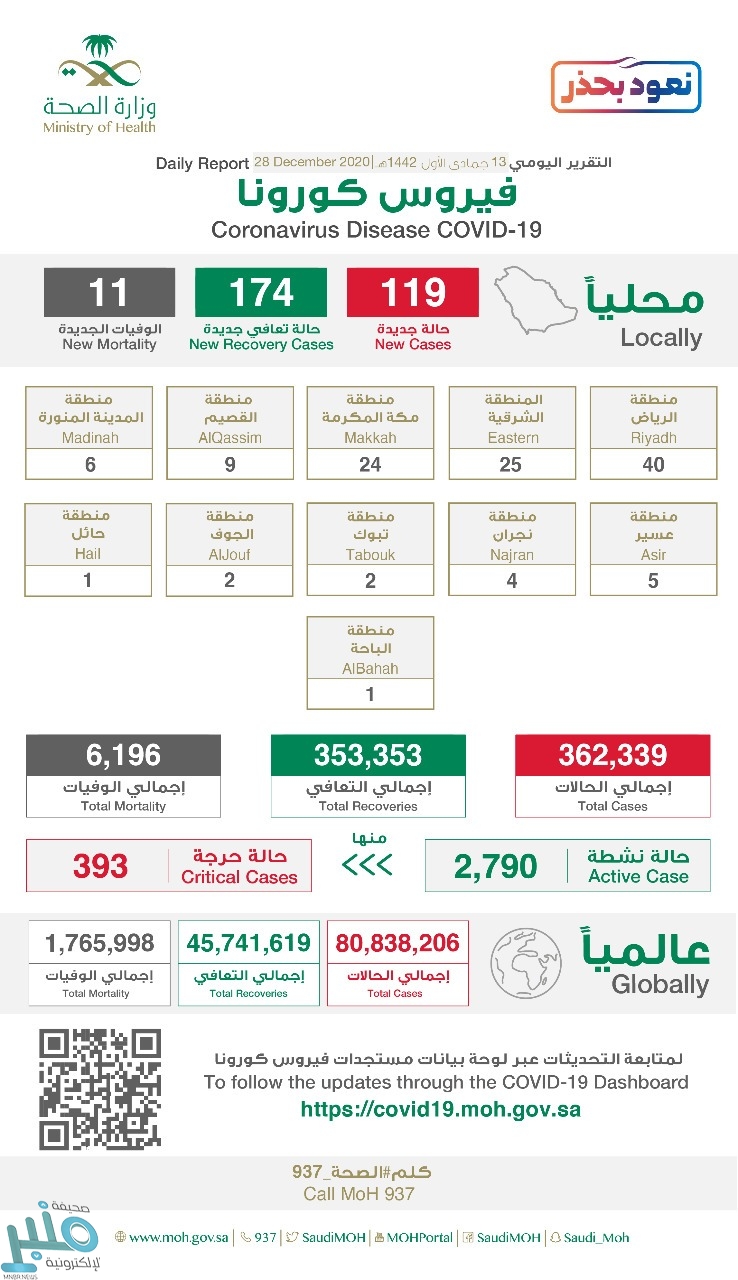 وأضافت الصحة أن إجمالي حالات المصابين في المملكة وصل إلى 362339 حالة حتى الآن ، ووصل مجموع المتعافين إلى 353353 حالة ، فيما بلغ إجمالي الوفيات 6196 حالة وفاة .