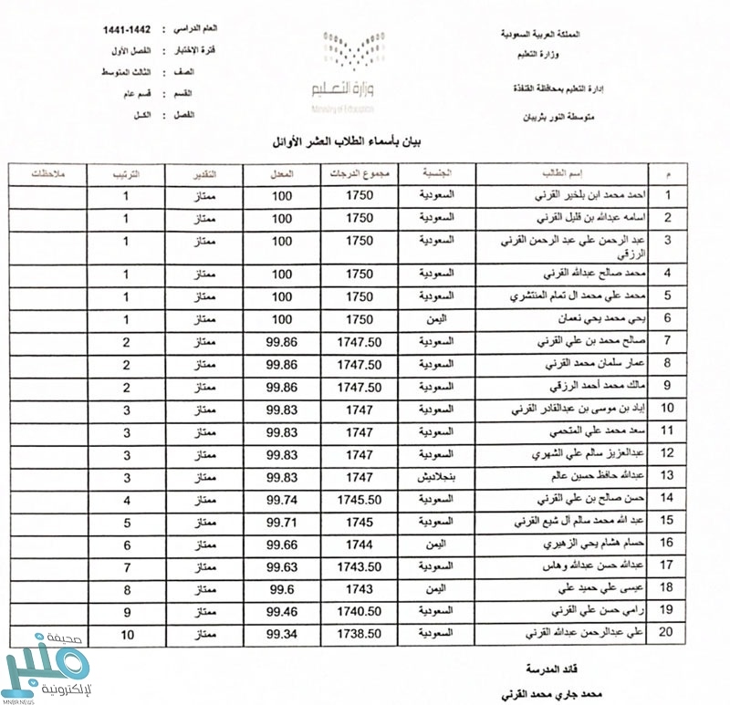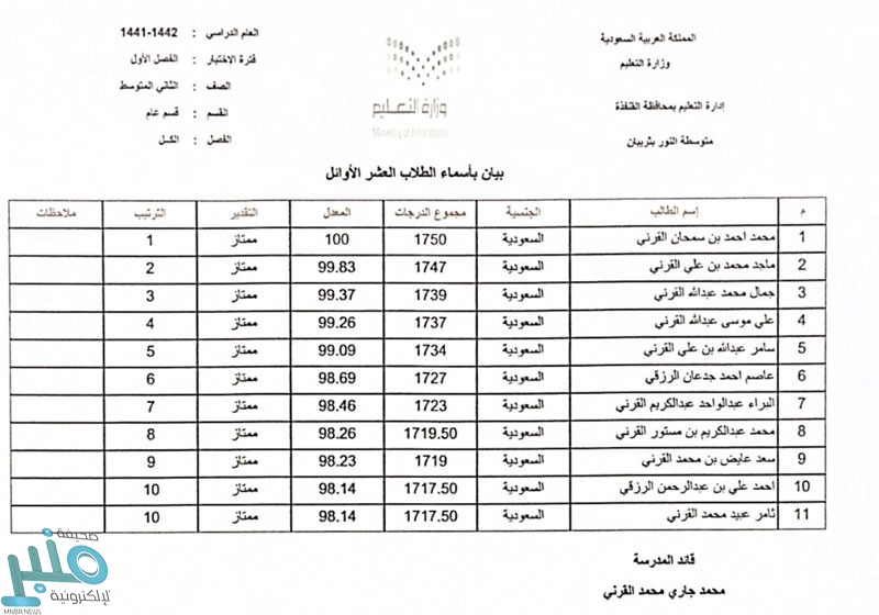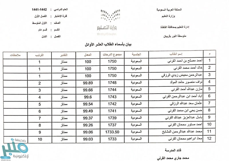 اعتمدت مدرسة النور المتوسطة بثريبان في محافظة العرضيات أسماء الطلاب الأوائل على الصفوف بنهاية الفصل الدراسي الأول ١٤٤٢ “التعليم عن بعد”.