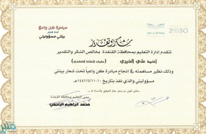 تلقى الزميل أحمد بن علي الخيري مشرف النشاط الكشفي ومراسل صحيفة “منبر” شهادة شكر وتقدير من إدارة تعليم القنفذة، وذلك نظير مساهمته في إنجاح مبادرة “كن واعيًا”، تحت شعار “بيئتي مسؤوليتي”.