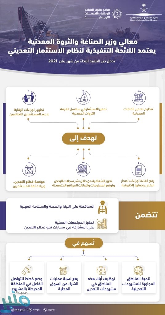 اعتمد معالي وزير الصناعة والثروة المعدنية الأستاذ بندر بن إبراهيم الخريّف اللائحة التنفيذية لنظام الاستثمار التعديني، والتي تدخل حيّز التنفيذ اليوم الموافق 1 يناير 2021م.