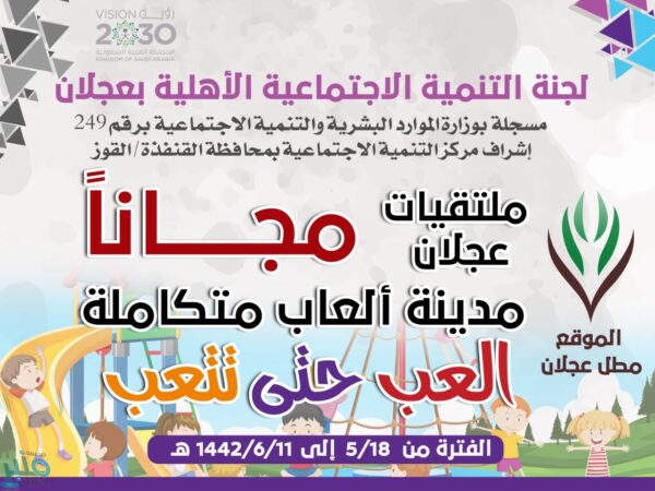 كما تقيم اللجنة “مهرجان الطفل” يوم السبت الموافق 1442/8/18 هـ، من بعد صلاة العصر ولمدة ثلاثة أيام ، وذلك بمطل عجلان ويتقدم خلاله جوائز قيمة، كما تشمل الفعاليات وجود مدينة ألعاب متكاملة للأطفال تحت شعار “العب حتى تتعب”.