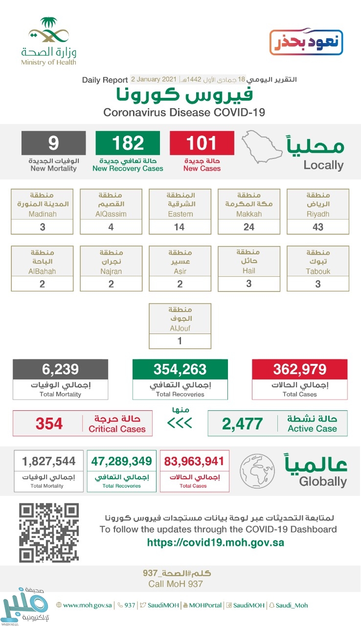 وأضافت الصحة أن إجمالي حالات المصابين في المملكة وصل إلى 362979 حالة حتى الآن ، ووصل مجموع المتعافين إلى 354263 حالة ، فيما بلغ إجمالي الوفيات 6239 حالة وفاة .