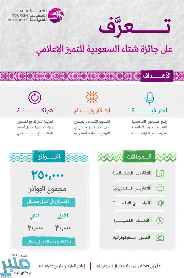 أعلنت الهيئة السعودية للسياحة المسؤول الرسمي الهوية الوطنية للسياحة “روح السعودية” عن “جائزة شتاء السعودية للتميز الإعلامي” وهي إحدى مبادرات موسم “الشتاء حولك”، وذلك لرفع مستوى الاحترافية والابداع، وتعزيز الشراكة مع المبدعين والإعلاميين، بمجموع جوائز تصل إلى 250 ألف ريال، في خمسة مجالات متنوعة، وهي “التقارير الصحافية، التقارير التلفزيونية، البرامج الإذاعية، الصور الفوتوغرافية، الأفلام القصيرة”.