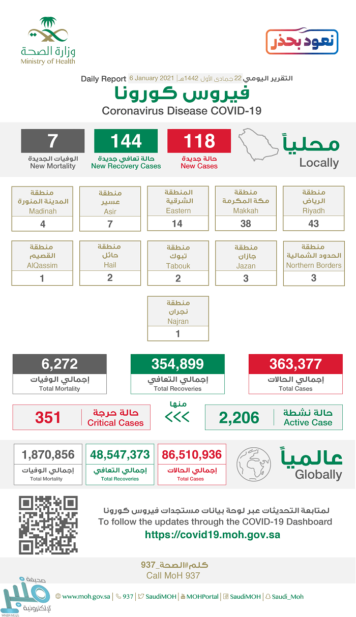 وجاء توزيع حالات الإصابة الجديدة بين مناطق المملكة كالتالي :
