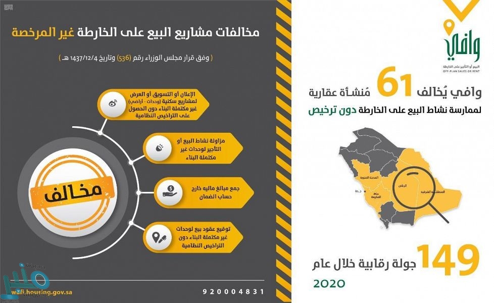 رصدت فرق الضبط والرقابة لبرنامج البيع على الخارطة “وافي” عددًا من المخالفات خلال جولاتها الرقابية على المشاريع في عدد من مدن المملكة، ضمن الجهود المكثفة التي تبذلها وزارة الإسكان ممثلةً ببرنامج “وافي” لتطبيق أنظمة وضوابط ممارسة أنشطة التطوير العقاري على الخارطة، حيث رُصد 61 مشروعًا مخالفًا في كل من الرياض وجده ومكة والمنطقة الشرقية والمدينة المنورة، فيما كانت عدد الجولات الرقابية خلال العام المنصرم 149 جولة.