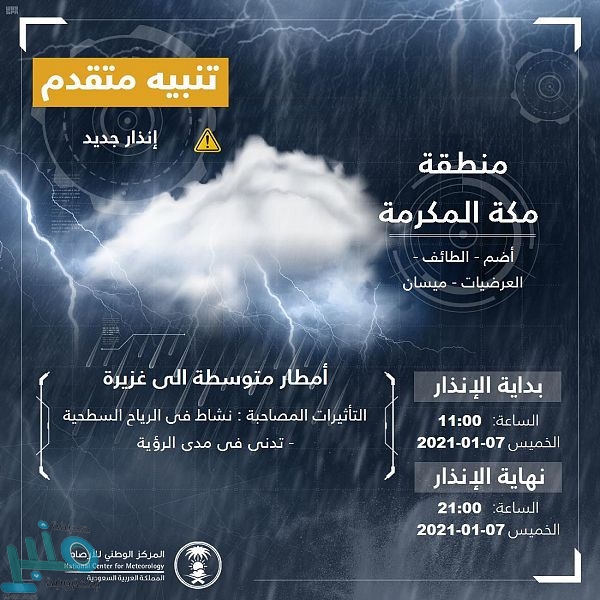 المركز الوطني للأرصاد ينبه على هطول أمطار رعدية على عدد من محافظات مكة المكرمة