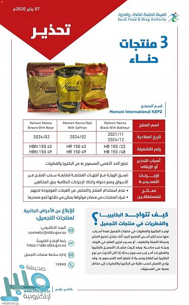 حذّرت الهيئة العامة للغذاء والدواء من ثلاثة منتجات من الحناء بسبب احتوائها على نسبة عالية من البكتيريا والفطريات تجاوزت الحد الأقصى المسموح به.