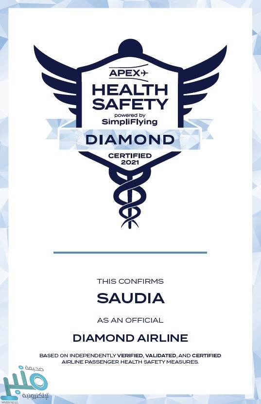 حصلت الخطوط السعودية ـ الناقل الوطني للمملكة ـ على التصنيف الأعلى “الدرجة الماسية” لشركات الطيران الأكثر أماناً صحياً في العالم، وذلك ضمن تصنيف منظمة APEX المتخصصة في قياس أداء وخدمات شركات الطيران والتزامها بأعلى معايير السلامة والجودة وتصنيفها بناءً على تقييم ملايين المسافرين في جميع أنحاء العالم.