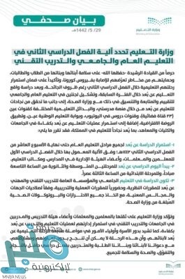 حرصا من القيادة الرشيدة حفظها الله- على سلامة أبنائها وبناتها من الطلاب والطالبات، وحمايتهم من مخاطر تعرضهم للإصابة بفيروس كورونا، وتأكيدا على ضمان استمرار رحلتهم التعليمية خلال الفصل الدراسي الثاني رغم ظروف الجائحة، وبعد دراسة واقع التعليم عن بعد خلال الفترة السابقة، وتشكيل لجنتين في التعليم العام والجامعي للتقييم والمتابعة والتنسيق في ذلك مـع وزارة الصحة، إلى جانب ما تحقق من نجاحات للتعليم عن بعد من خلال منصة مدرستي، والبدائل التعليمية المختلفة كقنوات عين