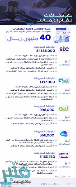 نشرت هيئة الاتصالات وتقنية المعلومات عبر موقعها الإلكتروني مجموعة من القرارات الصادرة عن لجنة النظر في مخالفات نظام الاتصالات، تضمنت عقوبات بغرامات مالية تجاوزت مبلغ 40 مليون ريال ضد عدد من المخالفين لنظام الاتصالات، من بينهم شركة الاتصالات السعودية (STC)، وشركة اتحاد اتصالات (موبايلي)، وشركة الاتصالات المتنقلة السعودية (زين)، وشركة اتحاد جوراء (ليبارا)، بسبب ارتكاب عدة مخالفات لنظام الاتصالات.