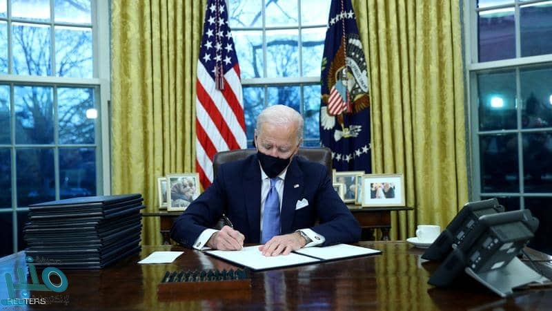 وفور توليه السلطة بعد حفل التنصيب، أعلن بايدن توقيع 17 قرارا تتصل بالعودة إلى منظمة الصحة العالمية واتفاقية باريس للمناخ ووقف العمل في الجدار العازل عن المكسيك، بالإضافة إلى إلغاء حظر السفر.