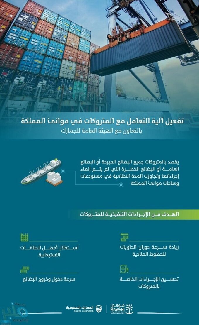 أعلنت الهيئةُ العامة للموانئ “موانئ” اليوم، بالتعاون مع الهيئة العامة للجمارك، عن اعتماد وتفعيل آلية جديدة لمعالجة بضائع وحاويات المتروكات في موانئ المملكة التي تتجاوز المدة النظامية في بقائها في مستودعات وساحات الموانئ.