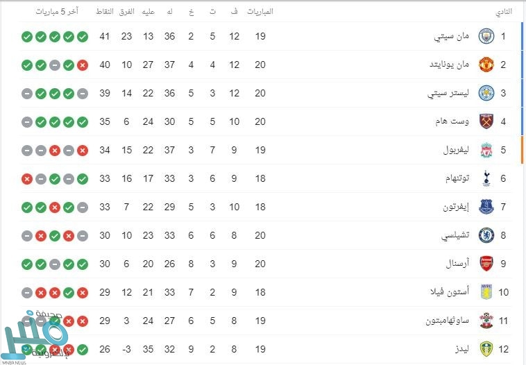 وبقي ليستر في المركز الثالث وله 39 نقطة من 20 مباراة متأخرا بنقطتين عن مانشستر سيتي الذي خاض 19 مباراة.