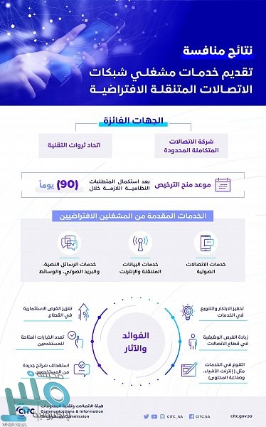 أعلنت هيئة الاتصالات وتقنية المعلومات اليوم، نتائج منافسة تقديم خدمات مشغلي شبكات الاتصالات المتنقلة الافتراضية (MVNO) التي أسفرت عن فوز كل من: شركة الاتصالات المتكاملة المحدودة، واتحاد ثروات التقنية بالمنافسة، ومنحهما (90) يومًا من تاريخ إبلاغهم بالفوز؛ لاستكمال المتطلبات النظامية اللازمة، مشددةً على أن عدم استيفاء إحدى الشركتين الفائزتين لتلك المتطلبات خلال المهلة المحددة سينتج عنه اختيار المرشح الثالث كبديل، على أن تطبق عليه الإجراءات النظامية نفسها حسب ما ورد في وثيقة طلب الحصول على الترخيص.