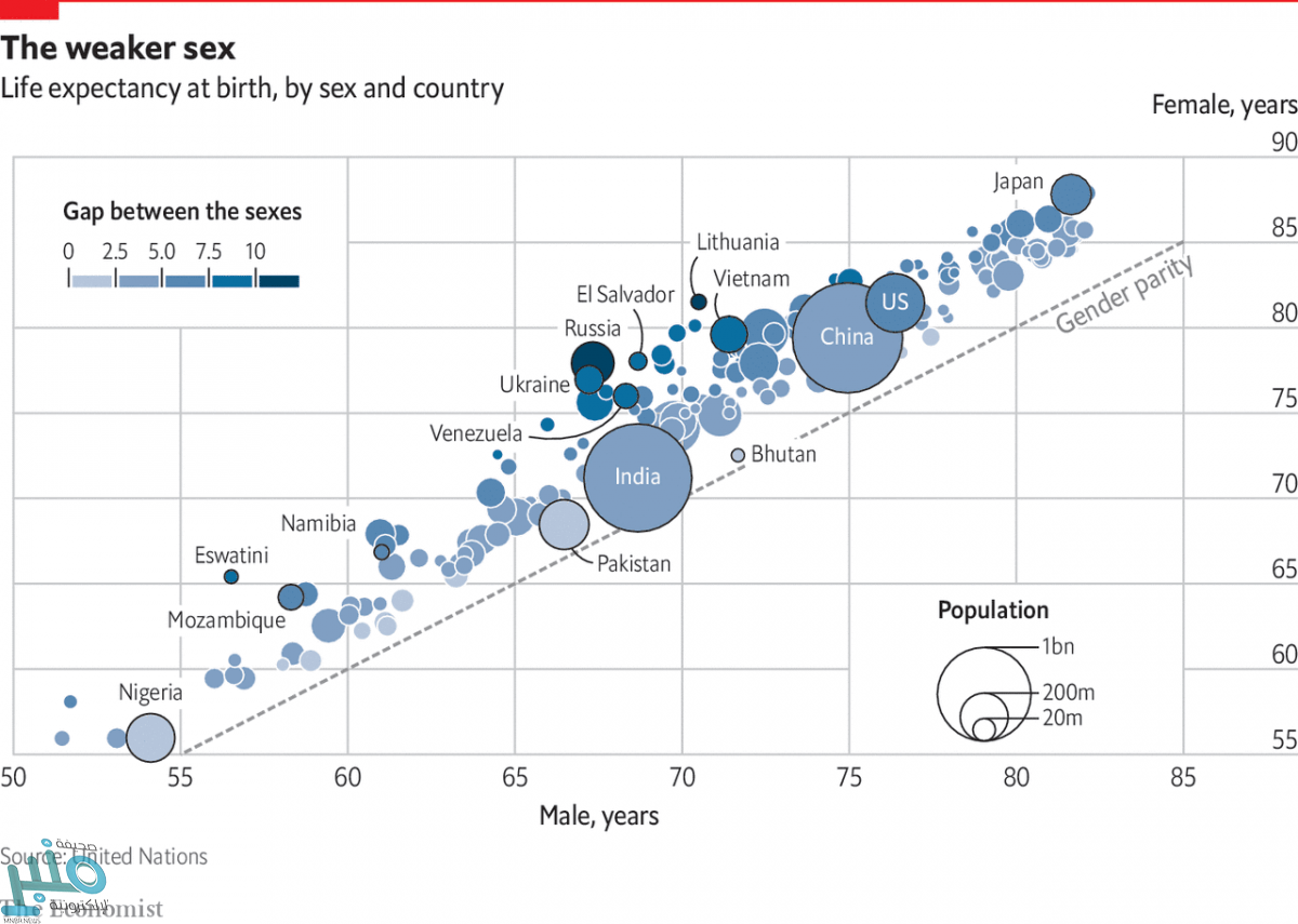ففي البيانات العالمية، تعيش النساء ما يقرب من خمس سنوات أطول من الرجال، بعد أن كانت ثلاث سنوات في عام 1950.