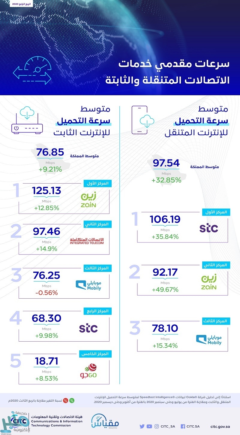 فيما تصدرت شركة “زين” قائمة مقدمي خدمات الاتصالات في سرعة الإنترنت الثابت بسرعة تحميل تبلغ 125.13 ميجابت في الثانية، مسجلةً نسبة تحسن تصل إلى 12.85% مقارنةً بأدائها في الربع الثالث من العام 2020، وجاء في المركزين الثاني والثالث على التوالي كل من شركة الاتصالات المتكاملة بمتوسط سرعة 97.46، وشركة “موبايلي” بمتوسط سرعة 76.25 ميجابت في الثانية.
