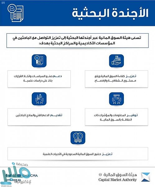 أطلقت هيئة السوق المالية النسخة الإلكترونية للأجندة البحثية التي تتيح للباحثين تقديم مقترحاتهم البحثية على الموضوعات المطروحة للدراسة من خلال الموقع الإلكتروني للهيئة.