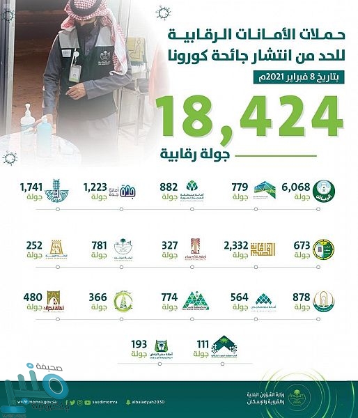 أكدت وزارة الشؤون البلدية والقروية والإسكان أن الأمانات والبلديات واصلت حملاتها الرقابية وجولاتها التفتيشية الميدانية في المنشآت والمجمعات التجارية وصالات الأفراح للتأكد من تطبيق الاشتراطات الصحية والتقيد بالإجراءات الوقائية والاحترازية، والإسهام في توعية المجتمع بضرورة التباعد الاجتماعي والالتزام بتطبيق التعليمات والتوجيهات الصادرة من الوزارة والجهات ذات العلاقة بالصحة العامة، وذلك للحفاظ على صحة وسلامة جميع أفراد المجتمع، ومنع انتشار فيروس كورونا المستجد (كوفيد 19).