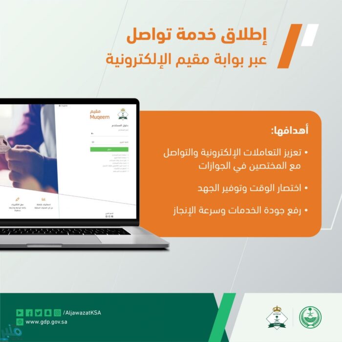 وتأتي خدمة تواصل المتاحة عبر بوابة مقيم في إطار جهود الجوازات لتعزيز التعاملات الإلكترونية والتواصل مع المختصين في المديرية، لمعالجة الملاحظات التي قد تواجه المستفيدين أو تظهر في البوابة وتعيق إنهاء معاملاتهم.