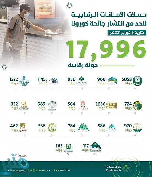 نفذت وزارة الشؤون البلدية والقروية والإسكان أمس (17996) جولة رقابية وتفتيشية على المنشآت الغذائية والأسواق والمراكز التجارية، وتهدف تلك الحملات الرقابية لتصحيح الممارسات الخاطئة، لتتوافق مع البروتوكولات الصحية والبلدية الرامية لحماية المجتمع ومنع انتشار الفيروس.