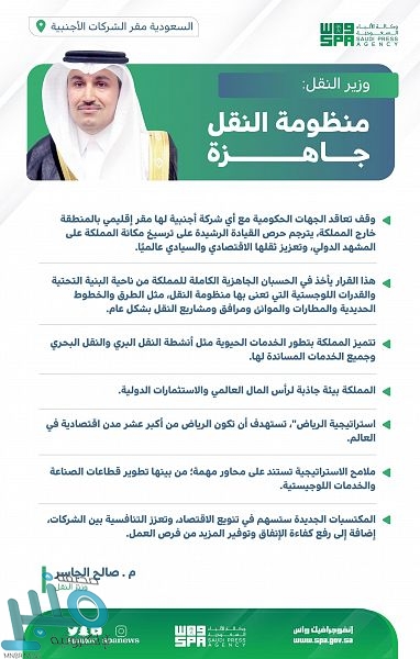 وأوضح معاليه في تصريح لوكالة الأنباء السعودية أن هذا القرار يأخذ في الحسبان الجاهزية الكاملة للمملكة من ناحية البنية التحتية والقدرات اللوجستية التي تعنى بها منظومة النقل، كالطرق والخطوط الحديدية والمطارات والموانئ ومرافق ومشروعات النقل بشكل عام، كما تتميز المملكة بتطور الخدمات الحيوية كأنشطة النقل البري والنقل البحري ونضوج جميع الخدمات المساندة لها، الأمر الذي يؤكد أن المملكة بيئة جاذبة لرأس المال العالمي والاستثمارات الدولية، بالإضافة إلى دعم الشركات الوطنية والإسهام في تمكينها للارتقاء بالخدمات التي تقدمها منظومة النقل لجميع المستفيدين.