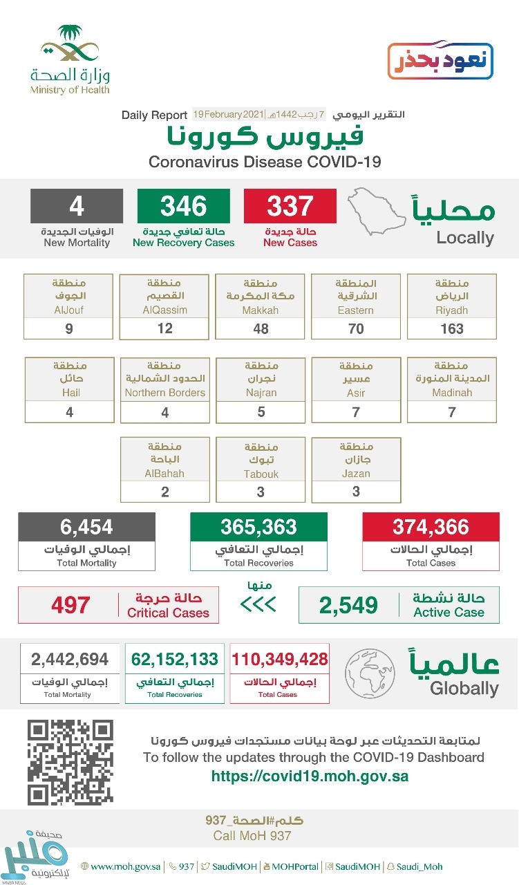 وأضافت الصحة أن إجمالي حالات المصابين في المملكة وصل إلى 374366 حالة حتى الآن ، ووصل مجموع المتعافين إلى 365363 حالة ، فيما بلغ إجمالي الوفيات 6454 حالة وفاة .
