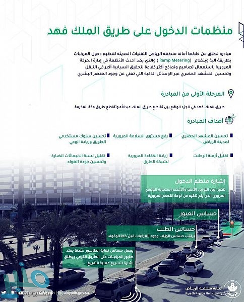 بدأت أمانة منطقة الرياض بتنفيذ المرحلة الأولى من مبادرة “منظمات الدخول الذكية على طريق الملك فهد”، باستخدام تقنية التنظيم الآلي (Ramp Metering) في المنطقة الواقعة ما بين تقاطعه مع طريقي الملك عبدالله ومكة المكرمة، وذلك ضمن جهود الأمانة للتحول نحو المدينة الذكية تماشيًا مع مستهدفات رؤية المملكة 2030.