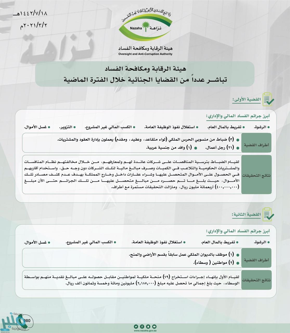 القضية الأولى: إيقاف (3) ضباط من منسوبي الحرس الملكي (لواء متقاعد، وعقيد، ومقدم) يعملون بإدارة العقود والمشتريات، و(21) رجل أعمال ووافداً من جنسية عربية، لقيام الضباط بترسية المناقصات على شركات عائدة لهم ولمعارفهم، من خلال مخالفتهم نظام المنافسات والمشتريات الحكومية، والتلاعب في الكميات، وصرف مبالغ مالية لتلك الشركات دون وجه حق، واستخدام أقاربهم في الحصول على الأموال المتحصل عليها، وشراء عقارات داخل وخارج المملكة بهدف عدم كشف مصادر تلك الأموال، حيث بلغ ما حُصر من مبالغ متحصل عليها من تلك الجرائم حتى الآن مبلغ (400.000.000) أربعمائة مليون ريال، ومازالت التحقيقات مستمرة مع أطراف القضية.