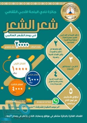 أعلن النادي الأدبي الثقافي بمنطقة الباحة عن جائزة نادي الباحة الأدبي الثقافي (شعر الشعر في يوم الشعر العالمي).