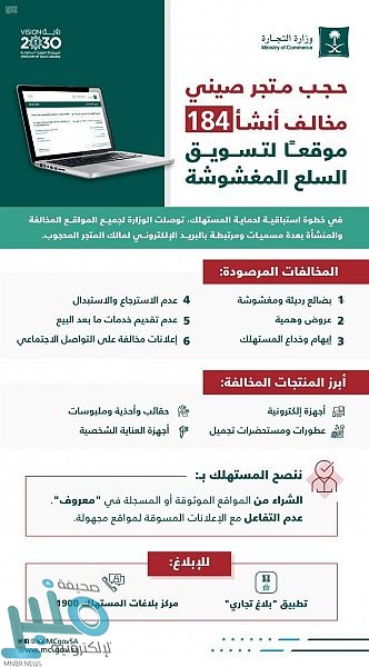 قادت متابعة ورصد وزارة التجارة للمتاجر الإلكترونية المخالفة إلى رصد متجر إلكتروني صيني مخالف يستهدف السوق السعودي بالبضائع الرديئة والمغشوشة والعروض الوهمية، ويستغل منصات التواصل الاجتماعي للترويج والإعلان عن تلك السلع مع عدم تنفيذ خيار الاسترجاع والاستبدال للمستهلك وخدمات ما بعد البيع وإيهام المشترين بجودة المنتجات المعروضة.