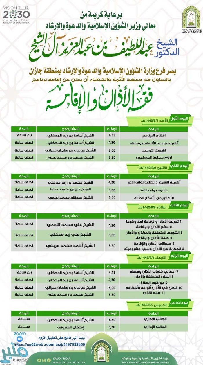 برعاية معالي وزير الشؤون الإسلامية والدعوة والإرشاد الشيخ الدكتور عبد اللطيف بن عبد العزيز آل الشيخ، وبالتعاون مع معهد الأئمة والخطباء، يقيم فرع وزارة الشؤون الإسلامية والدعوة والإرشاد بمنطقة جازان البرنامج العلمي “فقه الأذان والإقامة”، عبر محاضرات تبث عبر تطبيق زووم، يقدمها نخبة من الدعاة والمختصين.