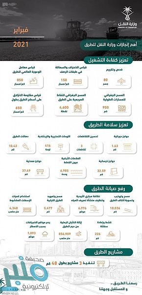 نفذت وزارة النقل خلال شهر فبراير الماضي، عددًا من الأعمال والمشروعات على الطرق التابعة لها في مناطق المملكة، بهدف رفع مستوى السلامة والجودة على الطرق وتعزيز كفاءة التشغيل، وذلك من خلال فحص وتحديد الاحتياجات وفق عدد من الإجراءات والدراسات والاختبارات، إضافة إلى رفع مستوى الطرق الترابية والقيام بأعمالها.
