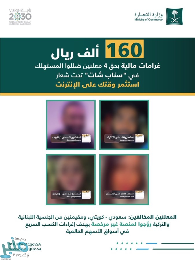 فرضت وزارة التجارة غرامات مالية بقيمة إجمالية 160 ألف ريال بحق 4 معلنين (سعودي وكويتي ومقيمتين من الجنسية اللبنانية والتركية) ضللوا المستهلك في “سناب شات”، بتعاملات مالية غير مرخصة تحت شعار “استثمر وقتك على الإنترنت”.