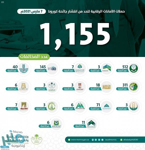 وأكدت الوزارة أن الفرق الميدانية في الأمانات والبلديات التابعة لها، قامت أمس، بتكثيف أعمال الرقابة، ونفذت (23298) جولة تفتيشية على المطاعم والأسواق ومحال الحلاقة وصالونات التجميل النسائي، فيما رُصدت (1155) مخالفة للبرتوكولات الصحية المحدّثة والتدابير الوقائية من فيروس كورونا، وإغلاق (275) منشأة مخالفة، وتطبيق العقوبات على المخالفين.