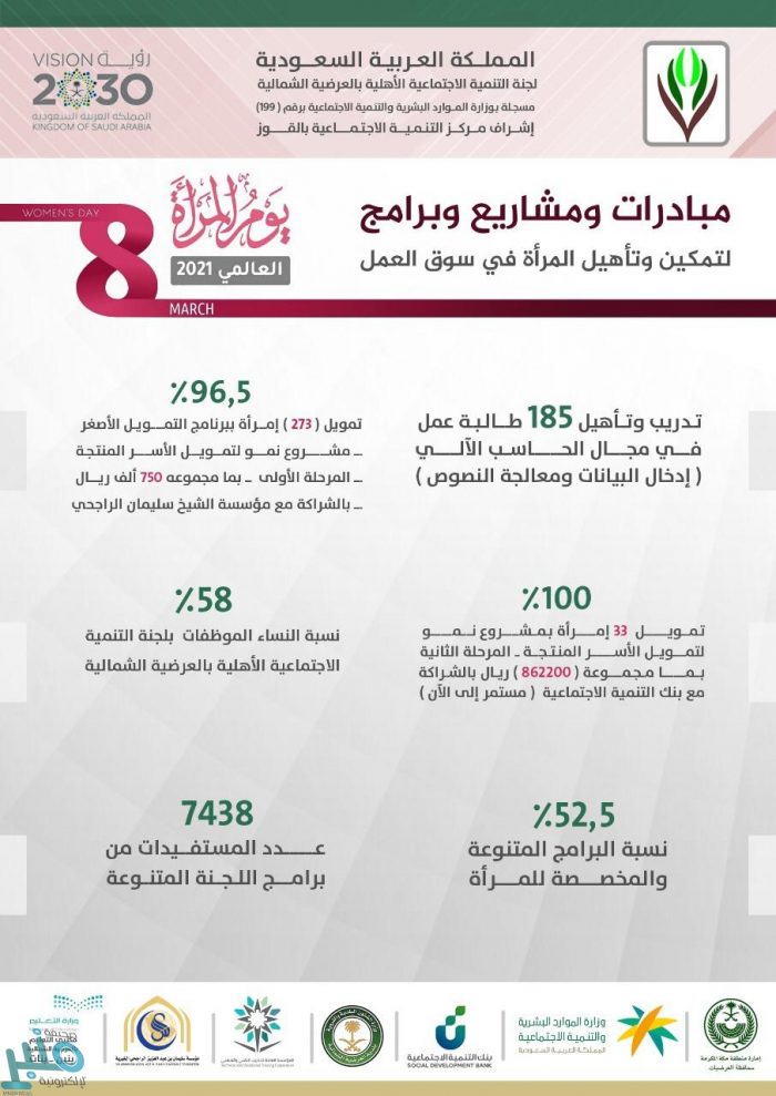 أقامت لجنة التنمية الاجتماعية الأهلية بالعرضية الشمالية برئاسة علي بن سلطان السهيمي، عددًا من المبادرات والمشاريع والبرامج لتمكين وتأهيل المرأة في سوق العمل.