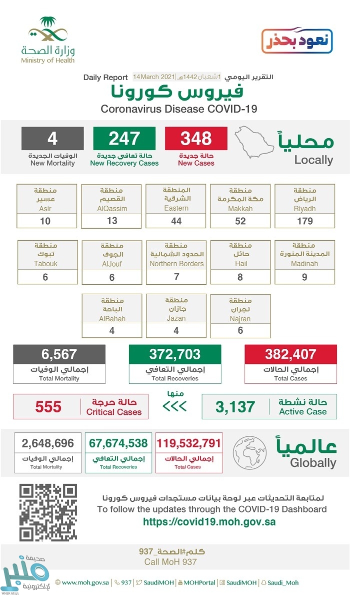 وجاء توزيع حالات الإصابة الجديدة بين مناطق المملكة كالتالي :