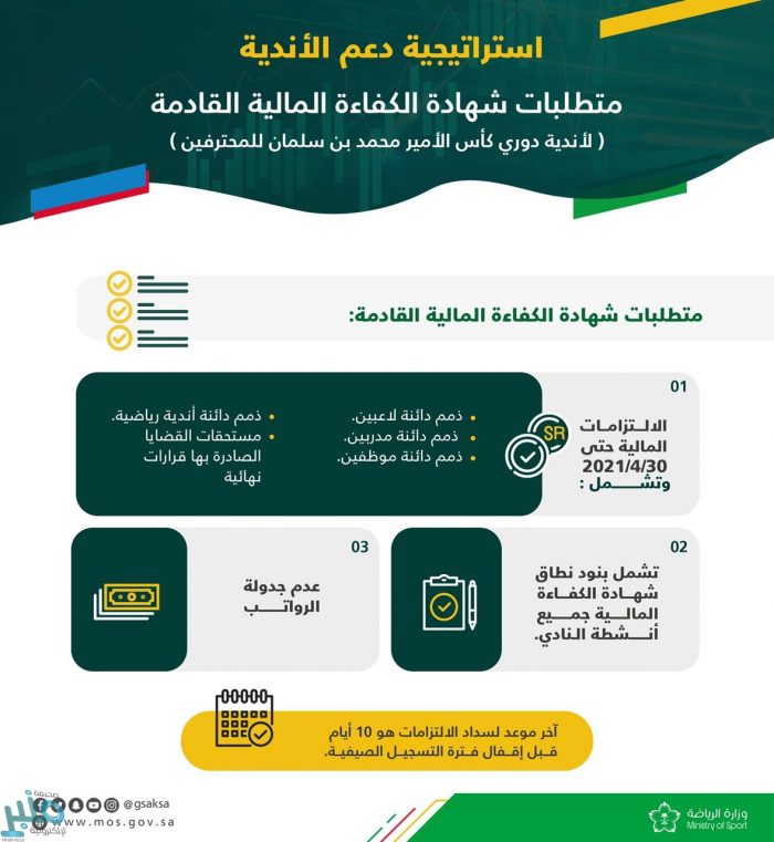 قررت لجنة الكفاءة المالية للأندية الرياضية بوزارة الرياضة، تحديد متطلبات شهادة الكفاءة المالية، القادمة، لأندية كأس الأمير محمد بن سلمان للمحترفين، وأندية دوري الأمير محمد بن سلمان للدرجة الأولى، التي تشترط كافة الالتزامات المالية المستحقة والواجبة في السداد حتى 30 أبريل المقبل.