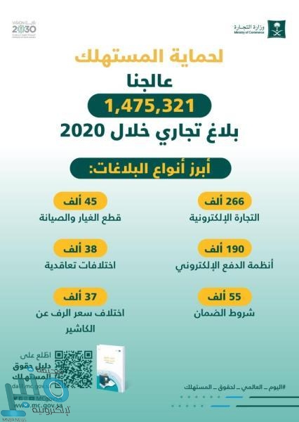اسفرت جهود وزارة التجارة الرقابية في معالجة 1.475.321 مليون بلاغ تجاري خلال العام 2020.