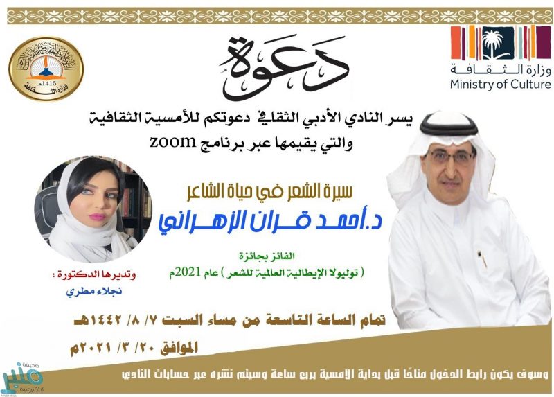 يستضيف النادي الأدبي الثقافي بمنطقة الباحة الدكتور أحمد قِـرّان الفائز بجائزة (توليولا الإيطالية العالمية للشعر)، وذلك يوم السبت القادم ٧-٨-١٤٤٢هـ ٢٠-٣-٢٠٢١م في أمسية ثقافية تديرها الدكتورة نجلاء مطري، مديرة صالون أدبيات.