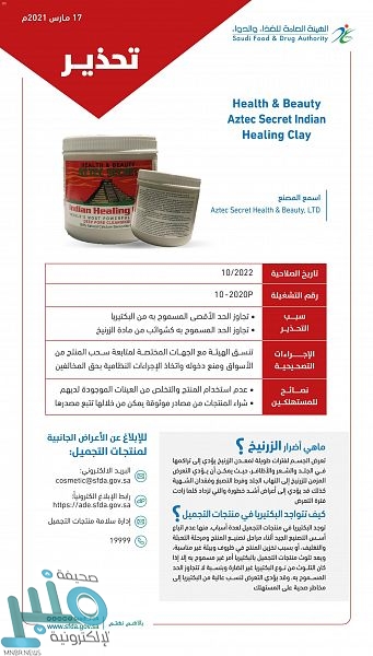 حذّرت الهيئة العامة للغذاء والدواء من منتج للعناية بالبشرة يحمل اسم ” Health & Beauty Aztec Secret Indian Healing clay ” لاحتوائه على نسبة عالية من البكتيريا والزرنيخ.