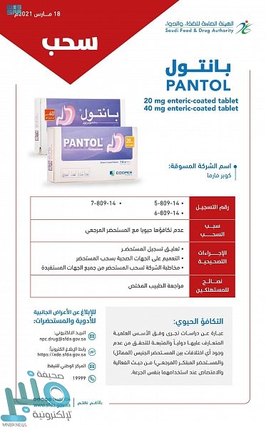 أصدرت الهيئة العامة للغذاء والدواء قرارا بتعليق تسجيل وسحب مستحضر ( PANTOL 20 mg enteric-coated tablet ) المسجل بالهيئة برقم (5-809-14)، وتعليق تسجيل وسحب مستحضر (PANTOL 40 mg enteric-coated tablet ) لرقمي التسجيل (7-809-14) و (6-809-14).